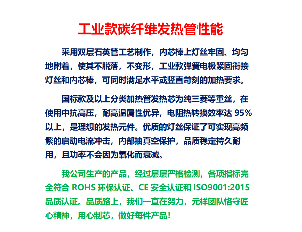1.电-热转换:长丝碳纤维发热丝热效能不低于95%,比镍铬、钨钼等材料作为发热体的加热器,理论可节能30%,内部抽真空处理,杜绝了电阻丝、卤索管在使用中容易断丝,寿命短等不利因素。